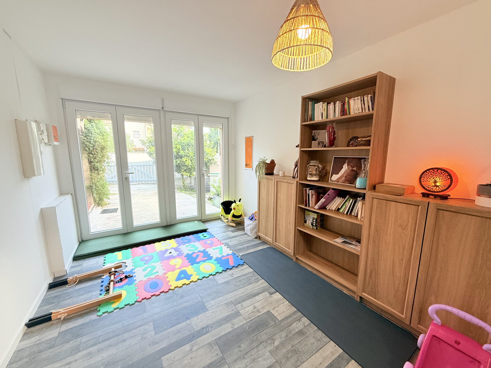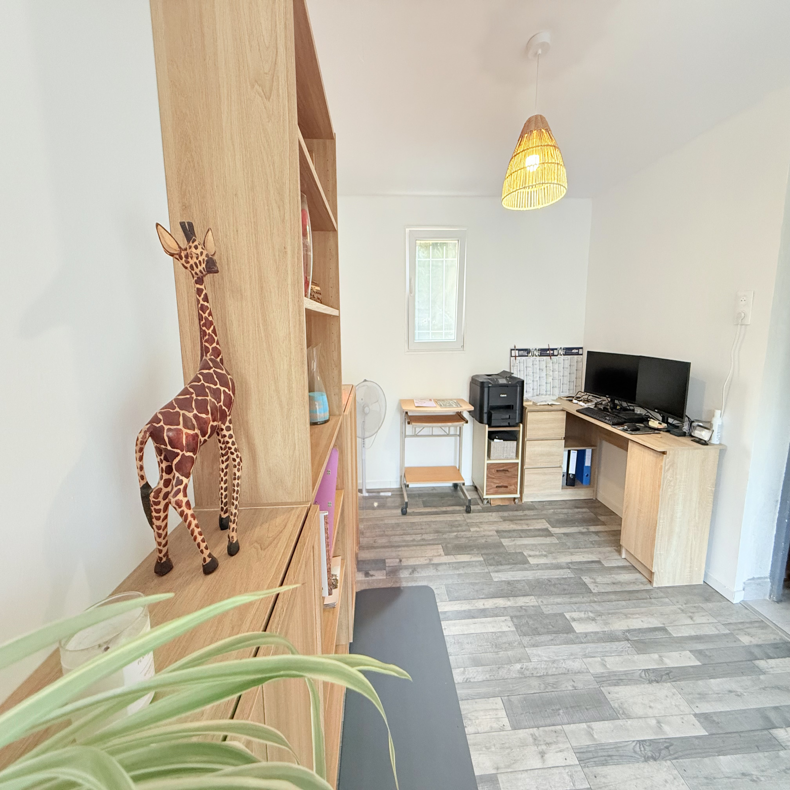 Au rez-de-chaussée, elle se compose d’un vaste séjour lumineux ouvert sur une cuisine aménagée et équipée, d’une salle d’eau avec WC, ainsi que d’un grand bureau pouvant facilement être transformé en chambre selon les besoins.