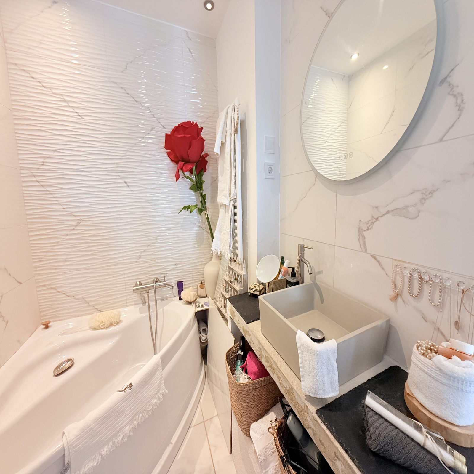 La salle de bain, moderne et élégante, dispose d’une baignoire d’angle, d’un meuble vasque design et de rangements intégrés.