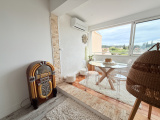 Il se compose d’un séjour chaleureux prolongé par une ancienne loggia entièrement fermée, aujourd’hui aménagée en agréable coin repas baigné de lumière naturelle et offrant une vue dégagée sur la verdure.