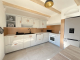En rez-de-jardin, un hall d’entrée accueille les visiteurs et ouvre sur un séjour baigné de lumière prolongé par une terrasse. La cuisine indépendante, aménagée et entièrement équipée, s’accorde naturellement aux volumes généreux du niveau. Deux chambres, une salle d’eau, des WC séparés, un espace buanderie ainsi qu’un garage électrifié de 20 m² complètent ce niveau.