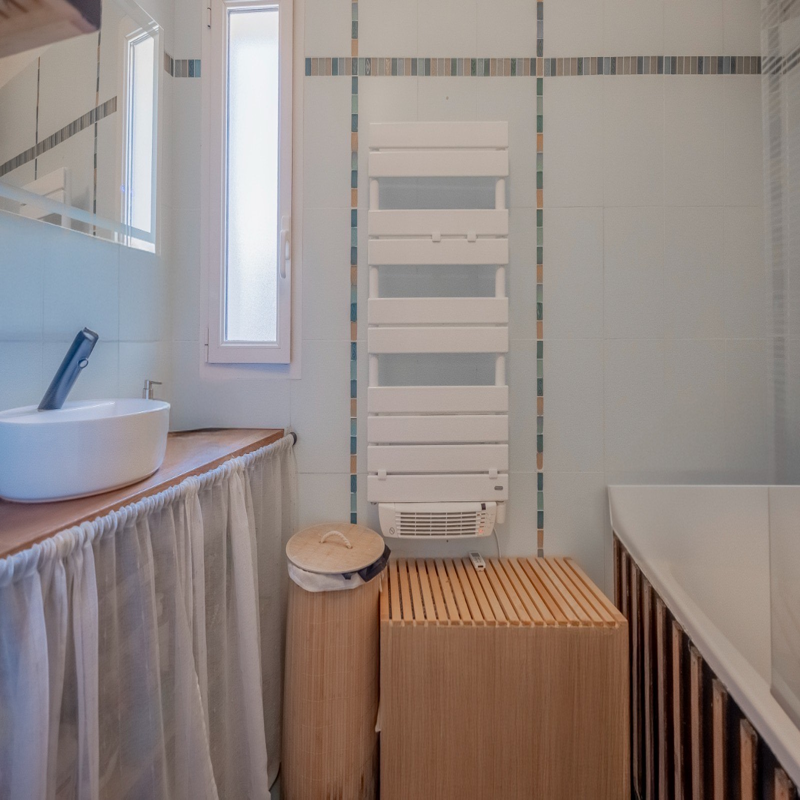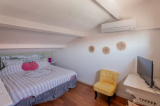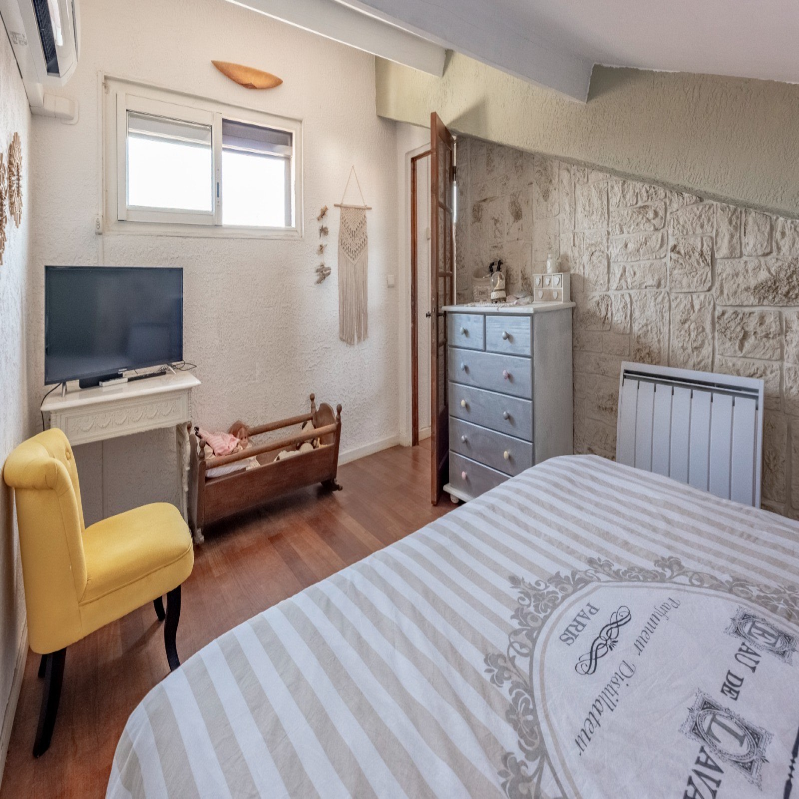 À l’étage, la mezzanine optimisée propose un espace bureau et un grand dressing, prolongés par une troisième chambre climatisée, fermée pour plus d’intimité.