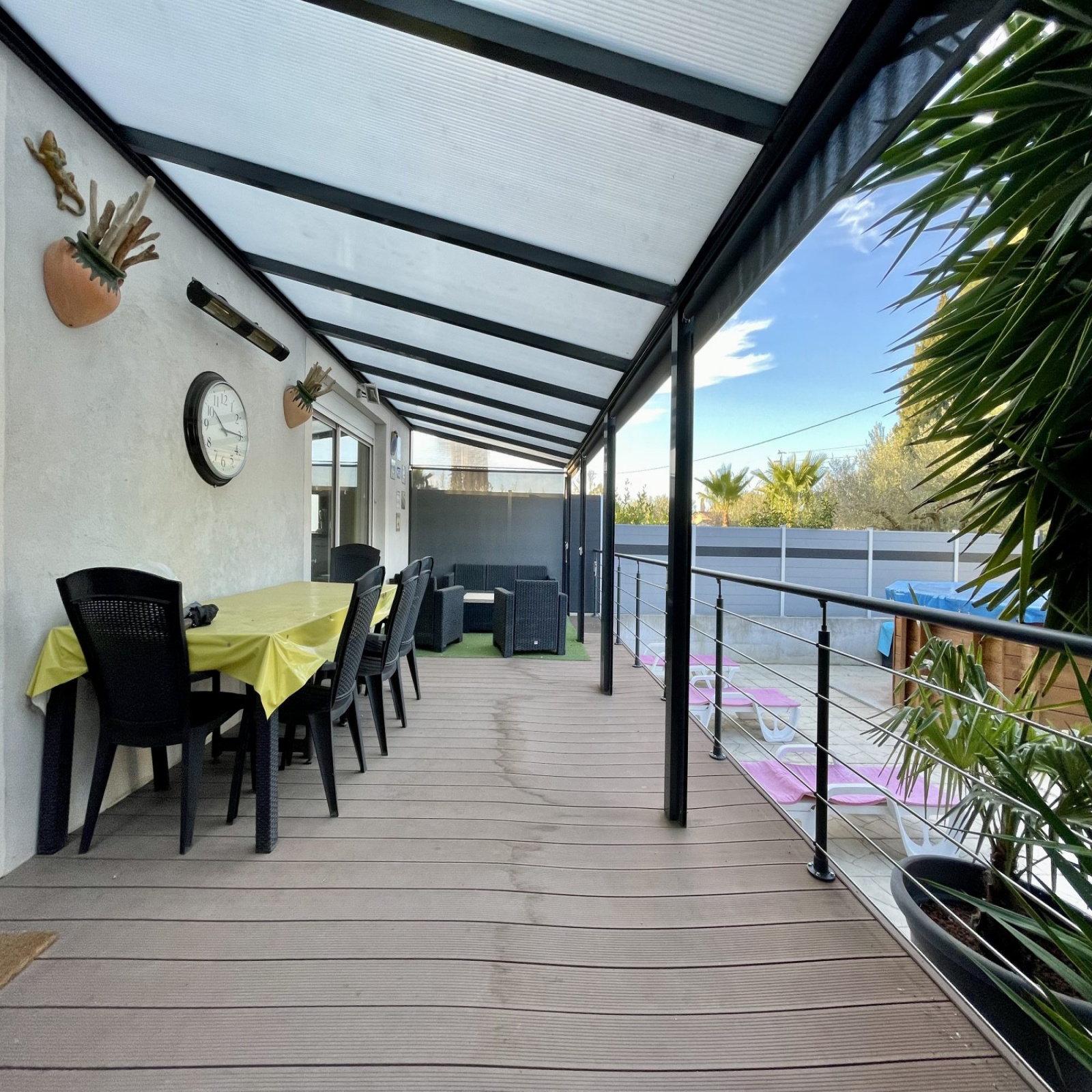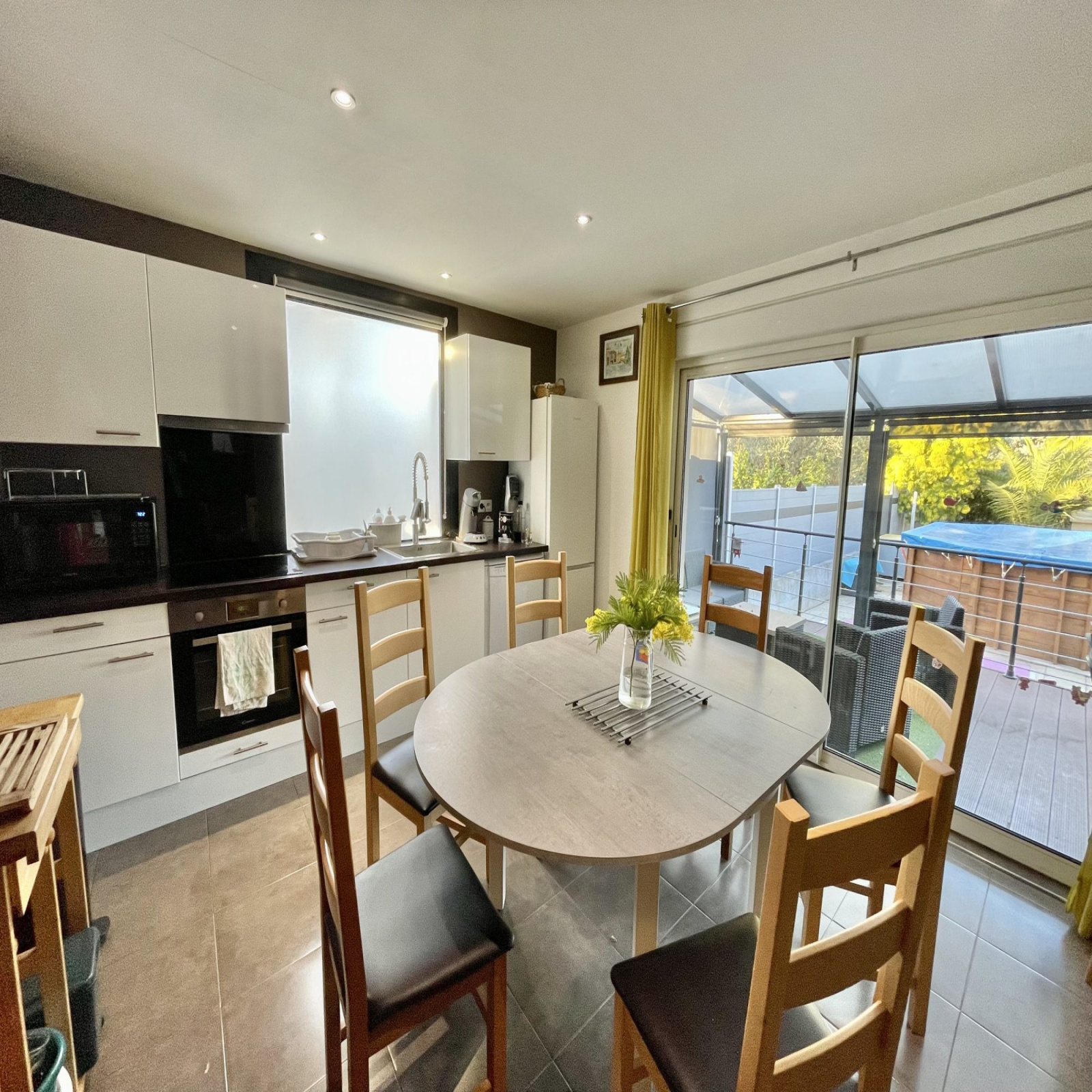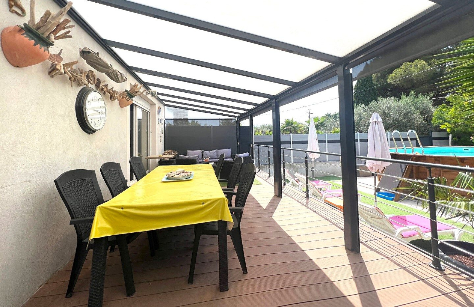 L'agencement harmonieux et la belle luminosité de cette propriété sauront vous séduire. Vous y découvrirez une pièce à vivre spacieuse ouverte sur une cuisine moderne entièrement équipée, avec un accès direct à une grande terrasse couverte d’environ 24 m² – idéale pour vos repas en extérieur ou vos moments de détente – ainsi qu’à une piscine.