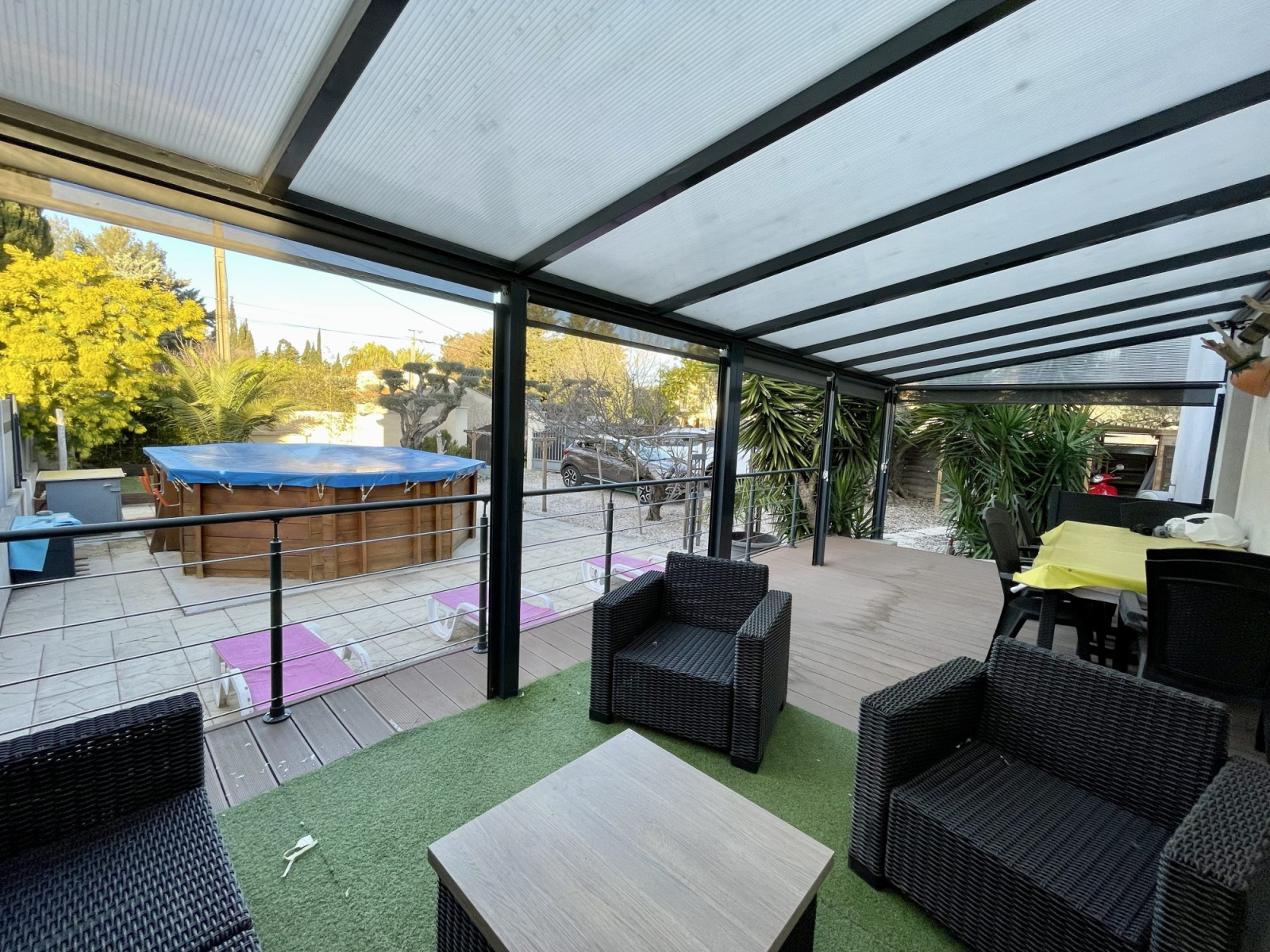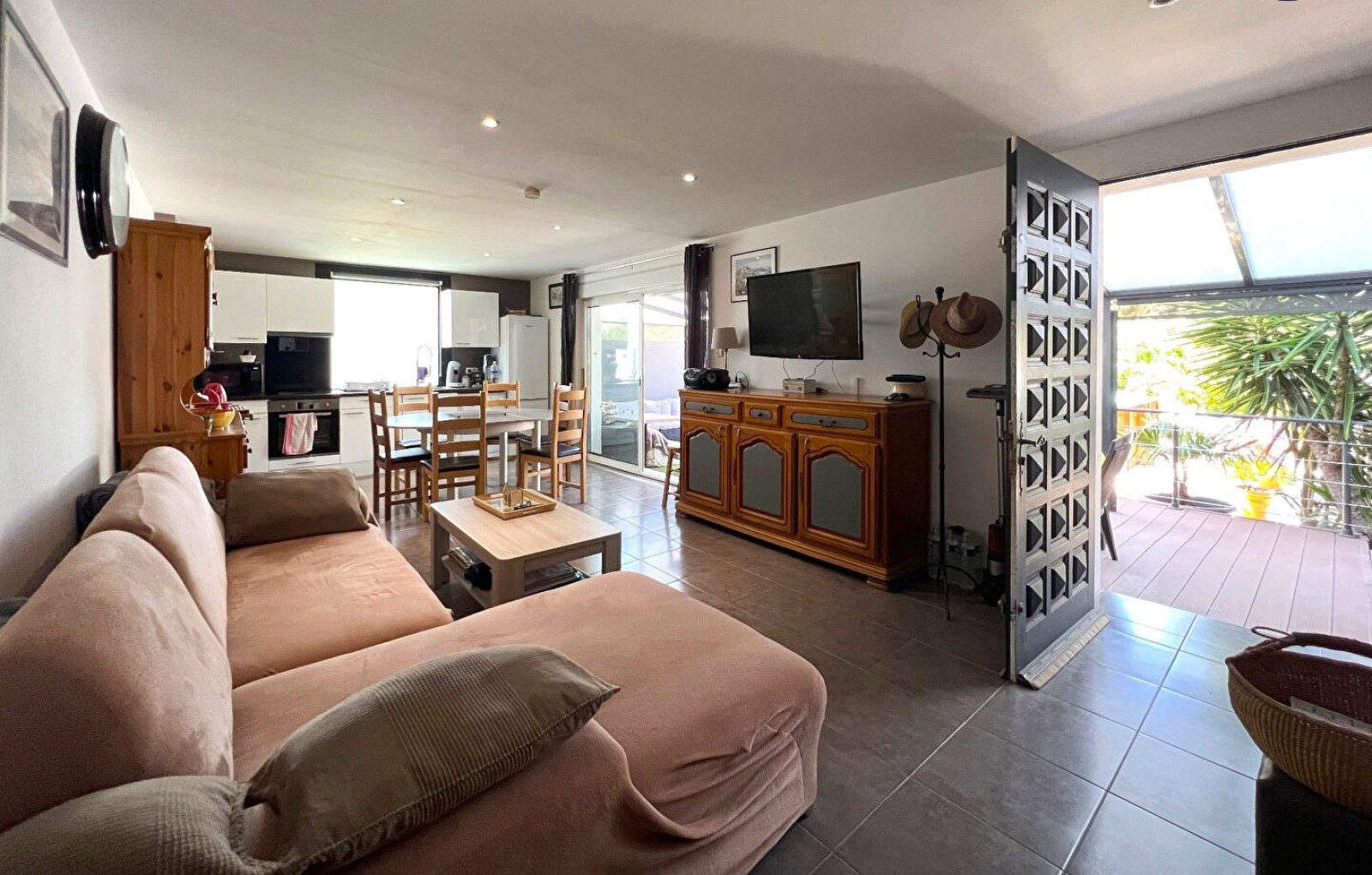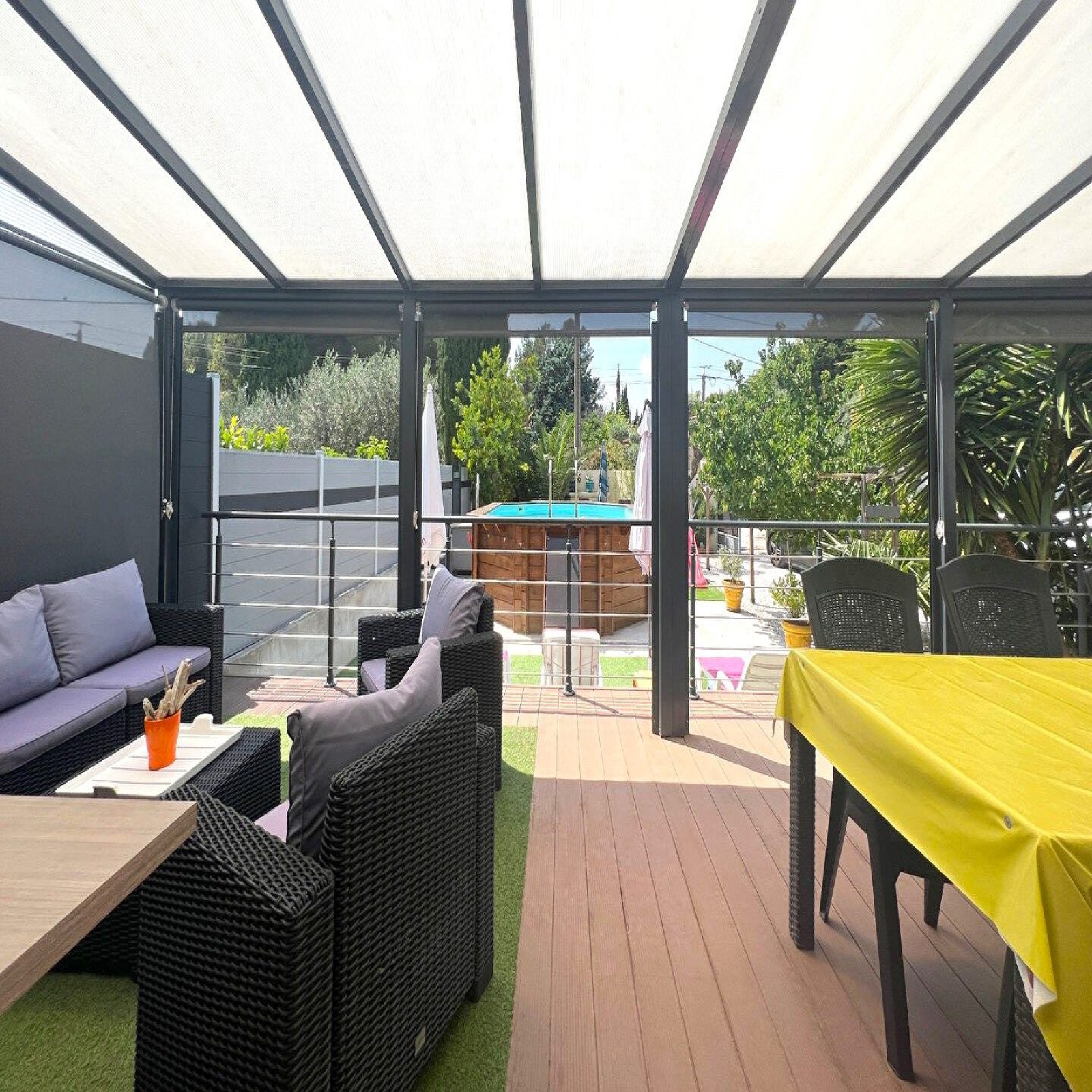 L'agencement harmonieux et la belle luminosité de cette propriété sauront vous séduire. Vous y découvrirez une pièce à vivre spacieuse ouverte sur une cuisine moderne entièrement équipée, avec un accès direct à une grande terrasse couverte d’environ 24 m² – idéale pour vos repas en extérieur ou vos moments de détente – ainsi qu’à une piscine.