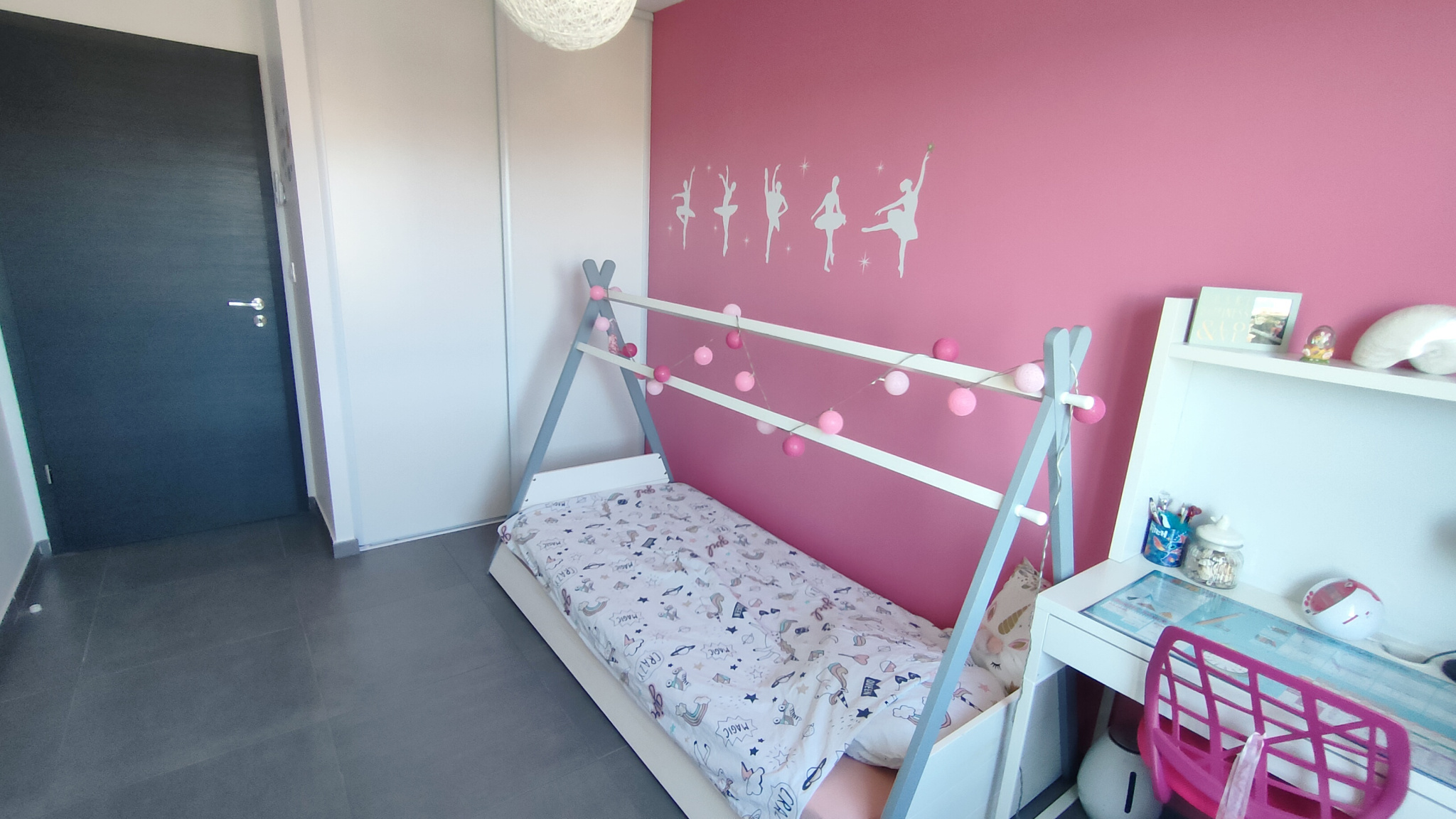 À l’étage, trois chambres avec rangements intégrés, une salle de bains et un WC indépendant complètent l’espace nuit.