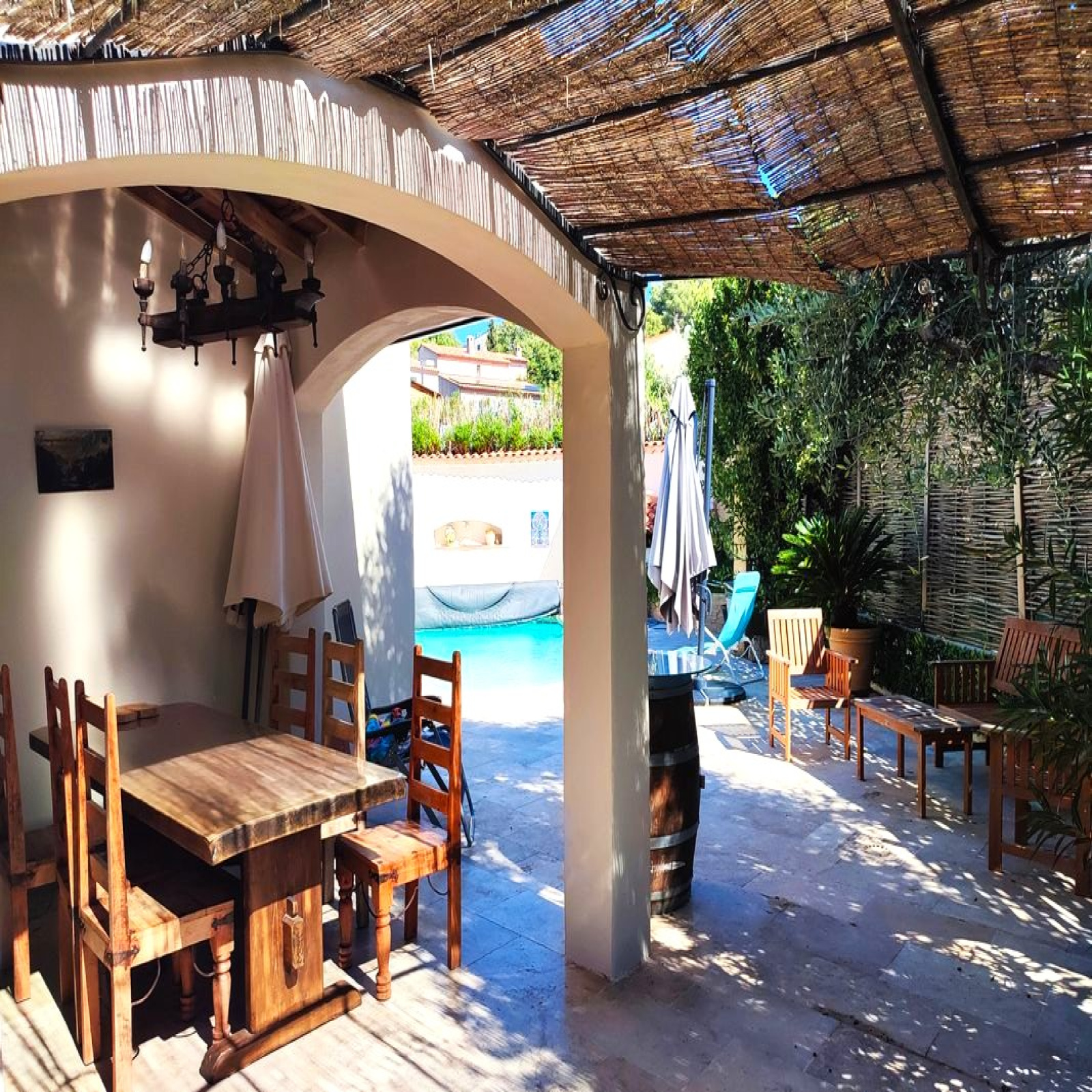 Extérieurs : grande terrasse en travertin d’environ 120 m², piscine au sel 6x4 m, deux parkings privatifs, local de 20 m² + cabanons, jardin.