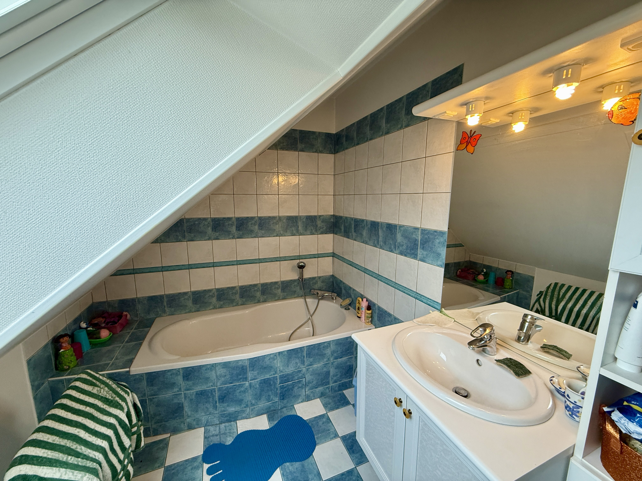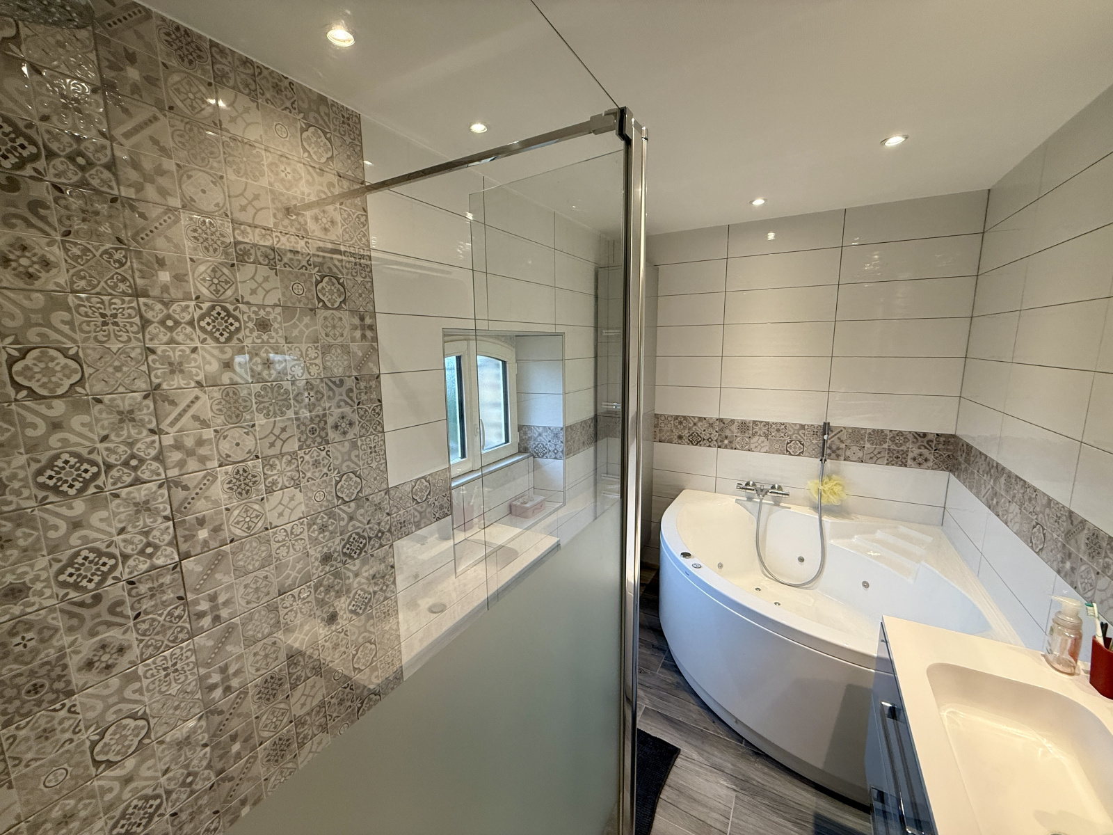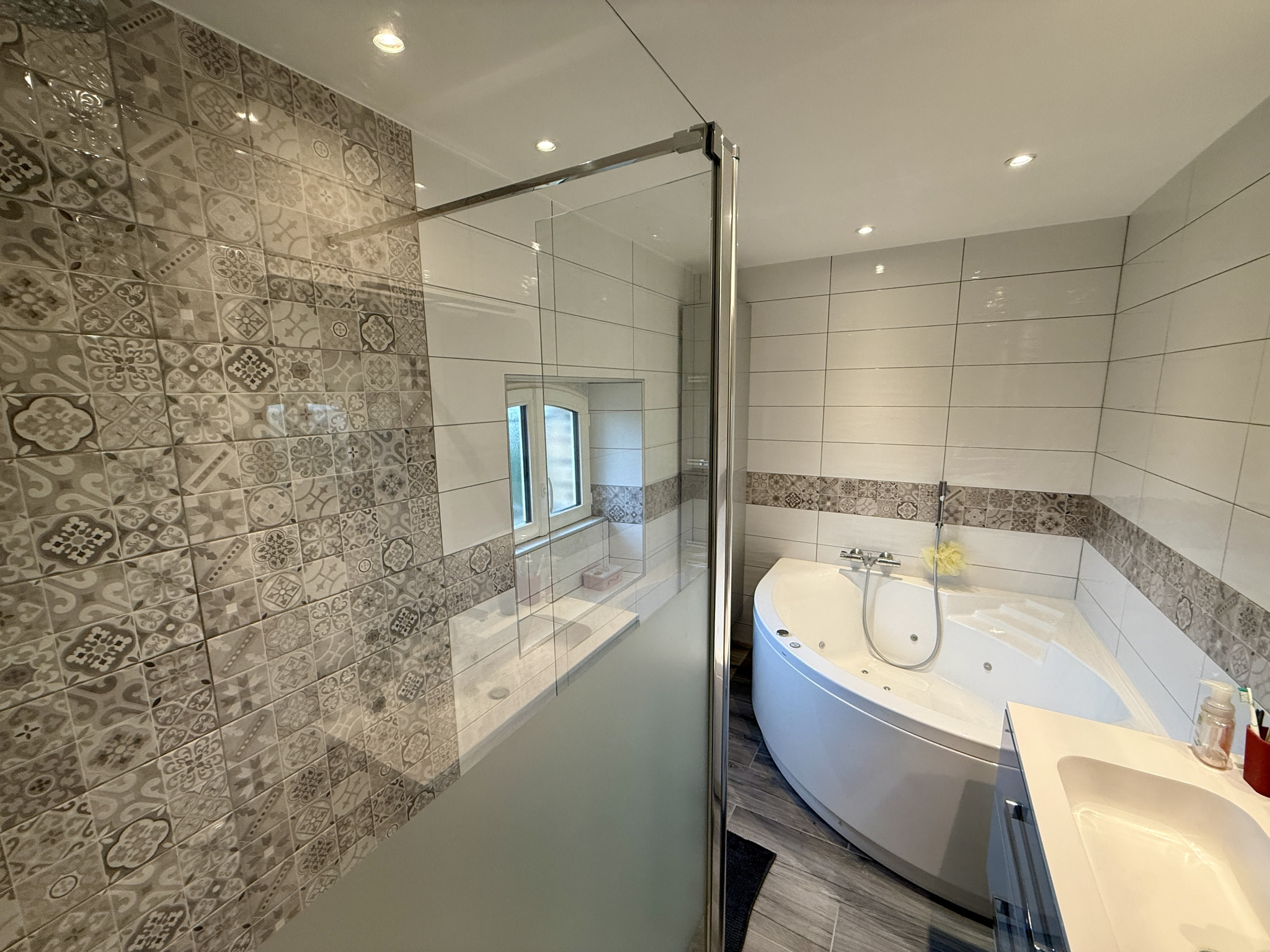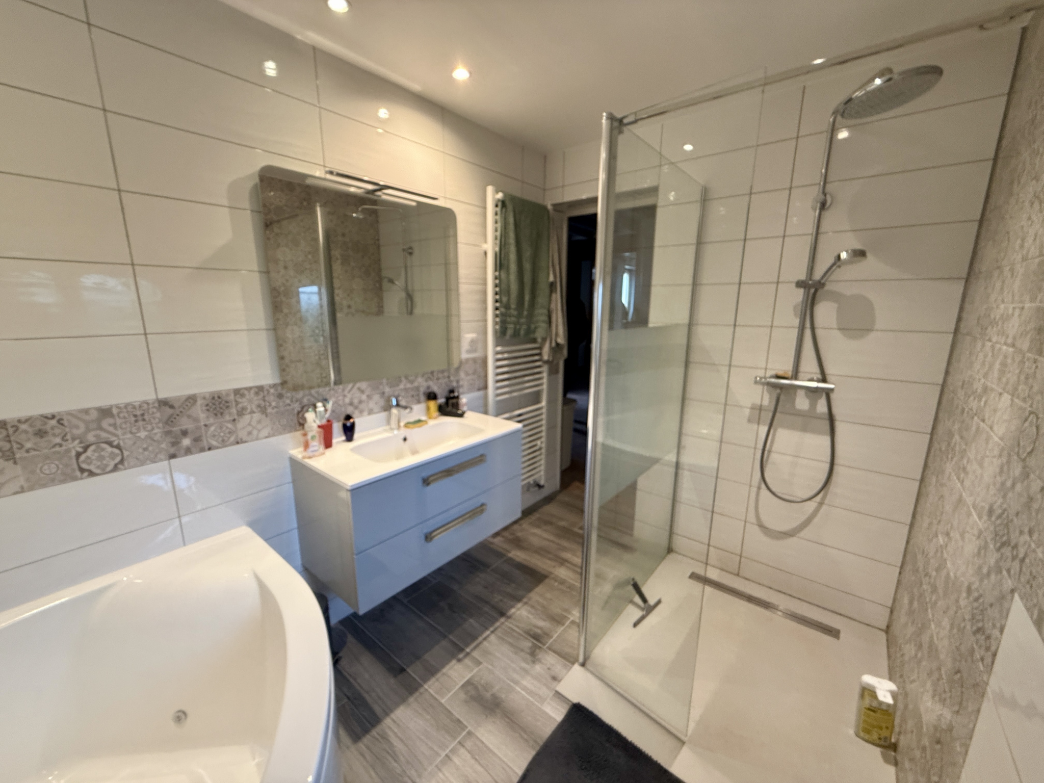 Le rez-de-chaussée propose également 1 chambre, salle de bains balnéo + douche et un WC indépendant.