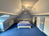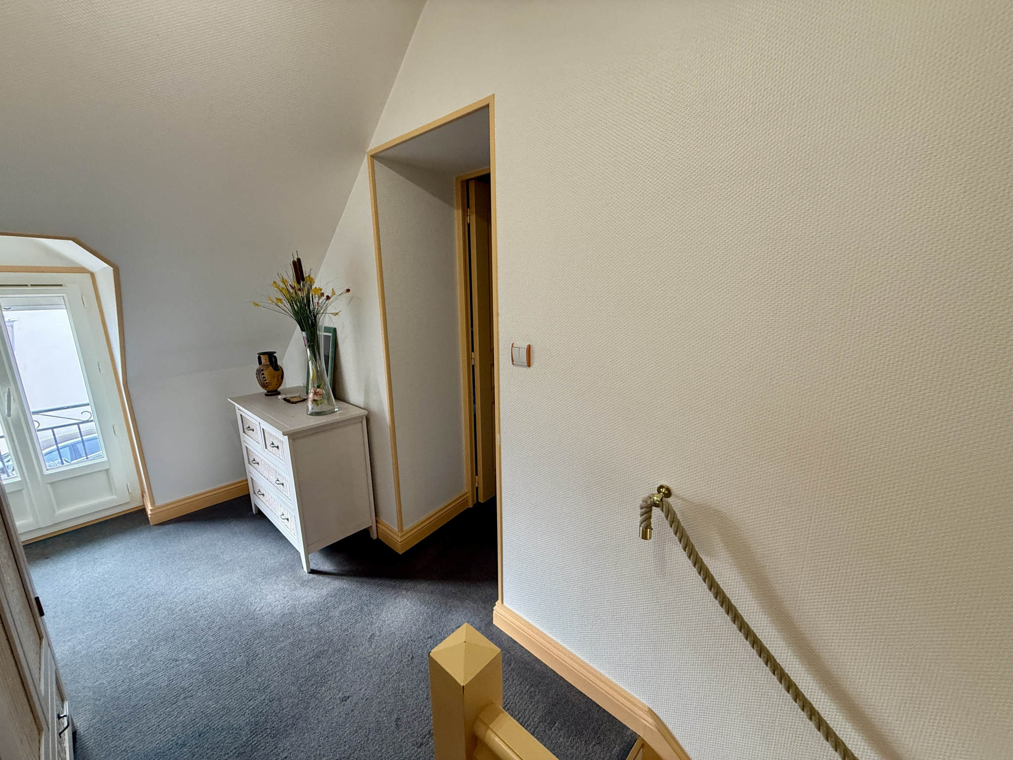 Une mezzanine spacieuse, aménagé en espace bibliothèque / coin détente d’environ 13 m², dessert 3 chambres dont une avec balcon. Une salle de bains et des WC complètent ce niveau.